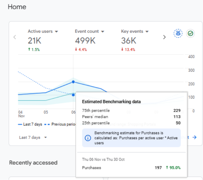 Now you can start exploring your benchmarking data and insights. In the below screenshot you can see this in practice. Using benchmarking data from the Google Store Demo GA account, we can see that the Google Merch site’s purchases are somewhere near the median performance for their peer category for Nov 6, 2025.